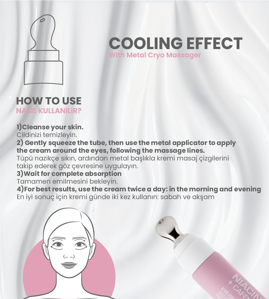 Nasıl Kullanılır: Tüp içerisinden yeterli miktarda ürün çıkarın. Kriyo soğutucu masaj başlığını, göz çevrenize hafifçe bastırarak dairesel hareketlerle masaj yapın. Tamamen emilene kadar bekleyin. Günde sadece 10 dakika ile gözle görünür bir sonuç elde edebilirsiniz.