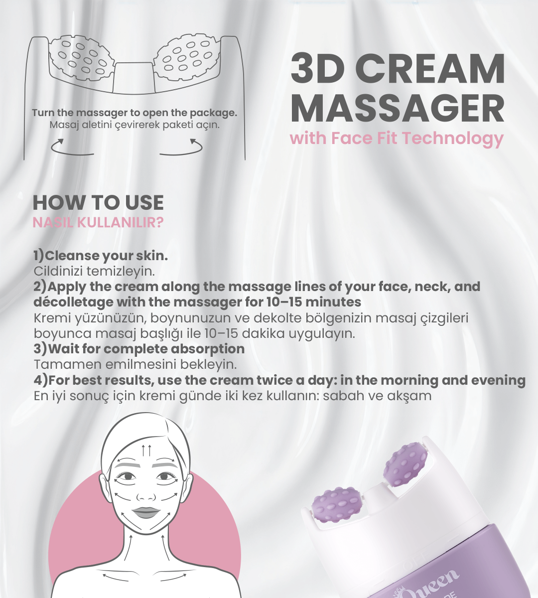 2. Masaj aletini kullanarak kremi yüz, boyun ve dekolte bölgenizin masaj çizgileri boyunca 10-15 dakika boyunca uygulayın ve dağıtın.